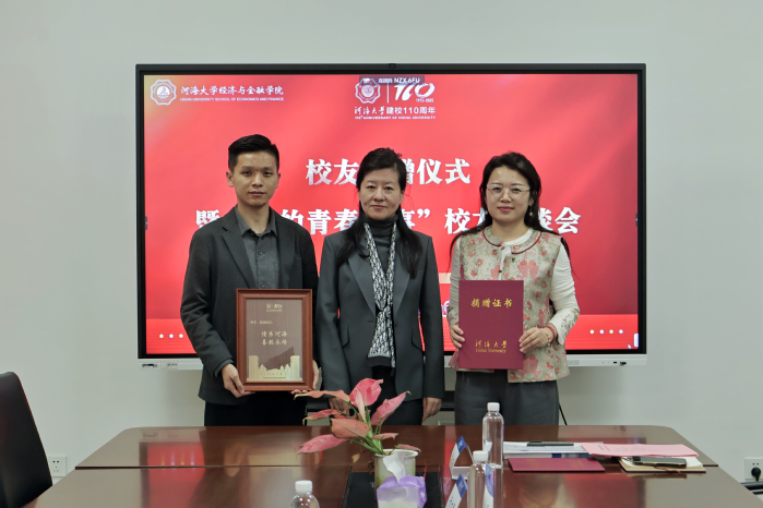 田苗、蒋涵捐赠30万元设立“新和思路发展项目”。蒋涵回顾了他从新疆远赴江苏求学,在国家创业政策与学校支持下在校创业的经历。他表示,学校和老师给予的充分包容是他能够兼顾创业与学业的关键,毕业近10年,他始终心系母校,恰逢学校建校110周年,希望通过捐赠的形式帮助学院搭建校内创业平台,为学生提供创新创业资金扶持,同时在未来进一步持续深化校企合作,搭建学校与新疆的交流通道,助力学校人才培养。