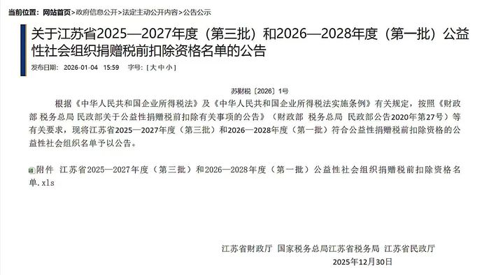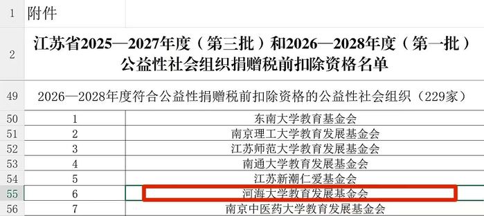 根据《中华人民共和国企业所得税法》及《中华人民共和国企业所得税法实施条例》有关规定,按照《财政部 税务总局 民政部关于公益性捐赠税前扣除有关事项的公告》(财政部 税务总局 民政部公告2020年第27号)等文件要求,江苏省财政厅、国家税务总局江苏省税务局、江苏省民政厅联合印发《关于江苏省2025—2027年度(第三批)和2026—2028年度(第一批)公益性社会组织捐赠税前扣除资格名单的公告》(苏财税〔2026〕1号)。河海大学教育发展基金会获批取得2026—2028年度公益性社会组织捐赠税前扣除资格。